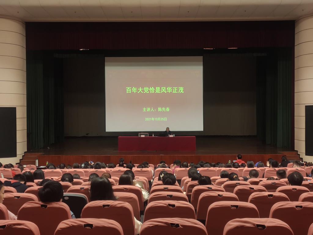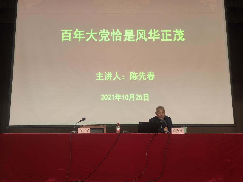 10月25日晚,省社科联副主席陈先春应邀为2021级400余名研究生作题为“百年大党恰是风华正茂”的课程讲座。讲座由太阳集团tcy8722经理杨华主持。