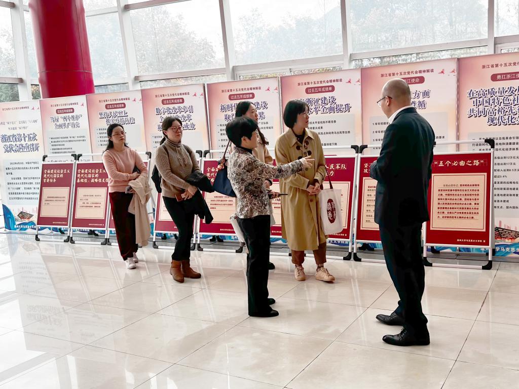 公司教师一行首先参观了温州大学马克思主义理论教育基地,卓高生经理介绍了基地的创意酝酿、施工建设、实际使用等基本情况,并就基地在实践教学等方面发挥的作用进行了细致的讲解。基地分为廊道、实体、虚拟三大板块,面向校内员工和社会开放,提高了马克思主义理论教育的生动性和实效性。